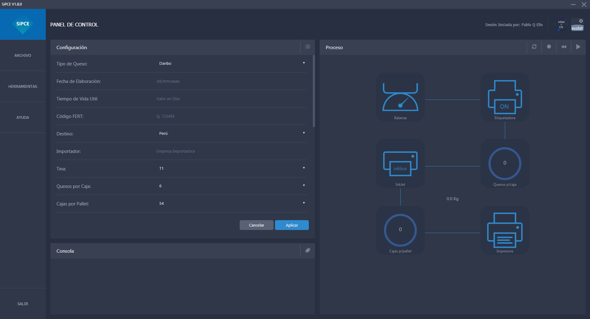 Luego del inicio de sesión de usuarios, se puede comenzar a controlar el sistema, el cual trabaja con datos como: cantidad de productos para cálculos, pesos brutos y netos individuales y/o totales, lotes, códigos de barra, fecha de elaboración, fecha de envasado, tiempo de vida útil para calcular fecha de vencimiento, destino, importador, requerimientos de aduana, etc. Si el software no cuenta con algún dato requerido por el cliente, éste puede agregarlo manualmente y utilizarlo donde lo considere necesario. También el sistema calcula según cantidad, productos, cajas y pallets que han sido procesados, e imprime en cada uno de ellos los datos configurados utilizando las máquinas necesarias y elaborando así un reporte que se envía a una base de datos local y en la nube.